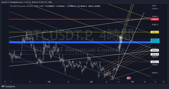 直近、最高値更新の攻防なので、先ほどのような微調整は当然発生する前提で、特にここからの新規ポジション構築は資金管理も含め慎重さが求められる。 #BTC