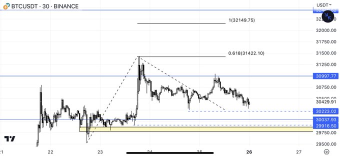 rendy分析 【BTC/USD】ビットコイン/ドル 1時間足 動きが出ずどっちつかずな感じですね。 高値を切り下げているので下とまだ見ていますが29779