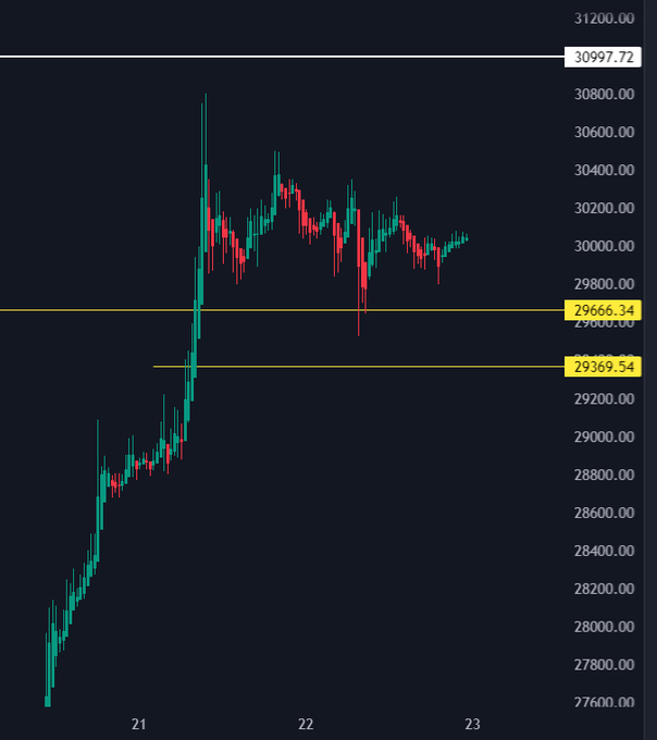 NY市場もBTCヨコヨコです 15分足200MAに沿ってるけど、どっかで上昇して31000抜けるのはありえるのだろうか(´・ω・`)? 動きが出るまで様子見です #BTC