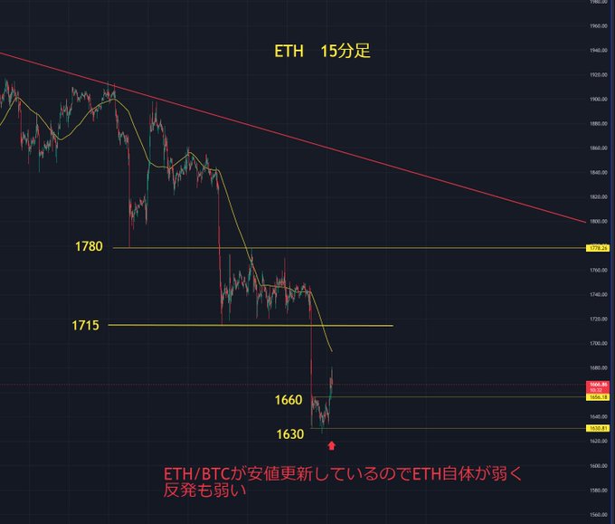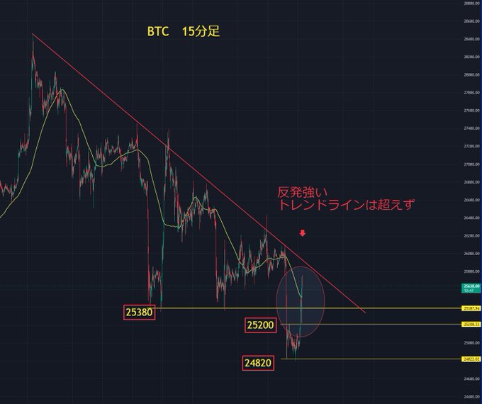 ◇BTC・ETH短期チャート(15分足) BTC反発強く、25380ラインより↗に超えました 狭いレンジで動きが早いとは思ってましたが、↗逆行したので短期の読みは外れになります(´・ω・`) トレンド転換かどうかは、短期足だとトレンドラインを超えてないので↘、中期足も↘のままと判断です…