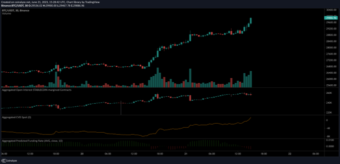 #BTC 4/14から2か月続いたチャネル、50日と100日の移動平均線を上抜けました。 かなり上値が軽くなり、2023年の最高値更新に向かいそうです。 ブラックロックの現物ETFの期待感や規制強化によるアルト離れが影響してそうです。
