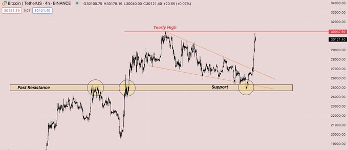 ◇BTC中期チャート(4時間足) 200MA↗向き、トレンド↗、強気相場入りです 200MAとトレンドラインを抜けて大陽線が発生しました これは力強い上昇トレンドの初動の動きであり、年初来高値31000を超え、次のステージに入る前段階です BTCは本格上昇トレンドに入るとレンジ幅が飛ぶことが多いです…