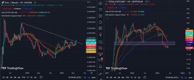Left side is $TRIAS / $BTC chart, right side is $TOTAL3