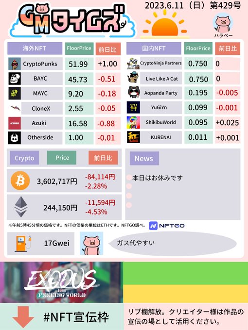 / gmです〜☀️ \ GMタイムズ 第429号。今朝のNFTフロアプライス、BTC・ETHの価格、GAS代、Web3ニュースをまとめました。