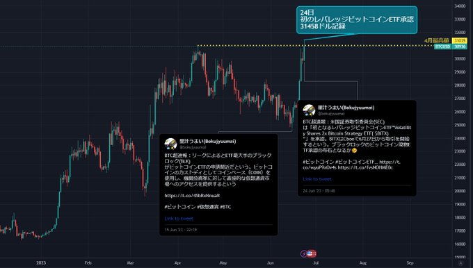 祝:ビットコインが4月の最高値を超えて一時31458ドルを記録🎉SECの初となるレバレッジビットコインETF承認が理由となっており、ブラックロックのビットコイン現物ETFに続く好ファンダメンタルとなる🤔 #ビットコイン