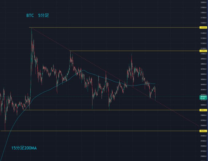 BTCが15分足200MAとトレンドライン抜けて上昇しました(´・ω・`) 抜けるときは勢いがあったのですが、このまま維持できるのかどうか見ています まだまだレンジ内の動きは続くのかもしれません #BTC