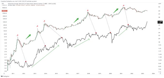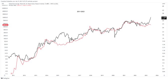 #btc BTC/USD vs. NIKKEI225 2011-2023 dönemi arası