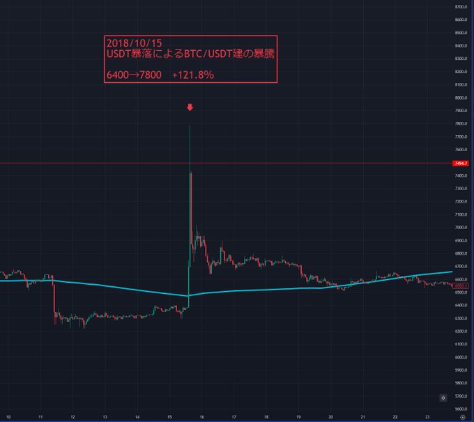◇USDTの下落 明確な原因は分かりませんでしたが、USDTがじわじわと下落しています 万が一、USDTが一時的に暴落した場合は、USDT建てが急上昇になります 過去の事例として2018/10/15のUSDT暴落による、一時BTC+121