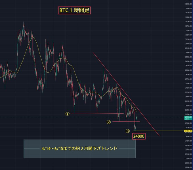 ◇BTCトレンド転換(?)解説編 今回の下げトレンドは4/14 31000ドルから6/15 24800ドルと約20%の下げとなりました また安値更新が3回ほどあり、じわじわと右肩下がりで下げ続けるため、底が見えづらく買い場がどこら辺なのか判断の難しいチャートと思います…