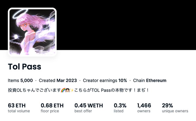 ✅TOL Pass 3日連続で動きなし🤣 今は価格が安定していて、フロア価格は0.68 ETHとなっております👧🏻✨ そろそろ新たな仲間が増えてほしい!✨ 素敵な人と出会えますように🕊️✨