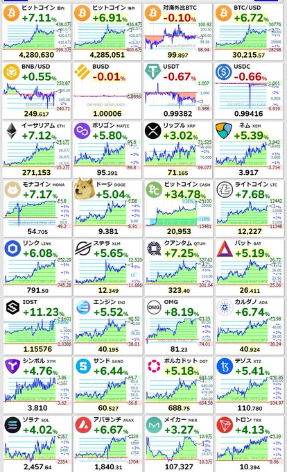 ETH以外のアルトはあんま見ておりませんが、全面高やん(´・ω・`) 今はBTCヨコヨコでアルトドレインのアルトターンっぽいですね #BTC
