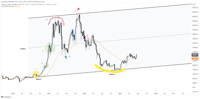 #btc この赤丸が超長期の上昇ラインになります。 ブレイクした際にはハンパじゃない上昇になると思う。 なので時間足か日足での調整を狙いたい。