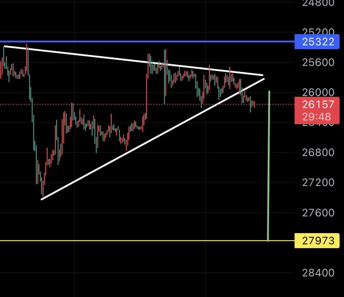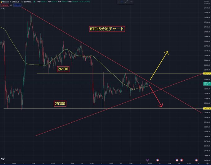 ◇BTC短期チャート(15分足) 高値切り下げ、底値切り上げのトレンドライン内で収束しています 書いてる途中で、若干↗抜けしつつありますが(´・ω・`) 底が固いのと、土曜からのアルト暴落相場が落ち着いてきたので短期目線は↗が優位と考えています #btc