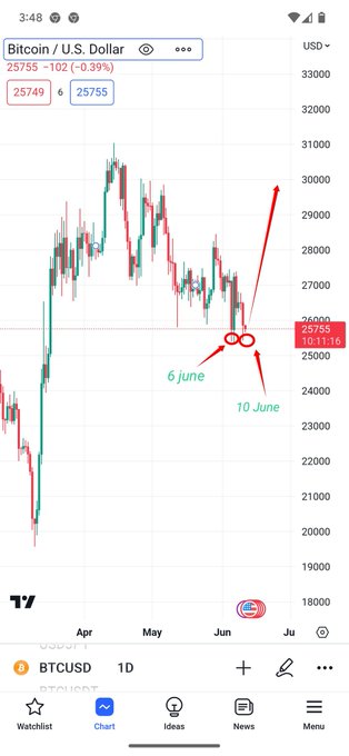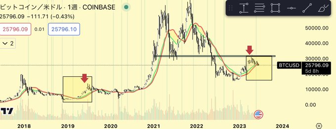 $BTC 25.300割るまでわかりませんが、現在かなりバッドに見えます。今年の天井が入った説あります。 CPI鈍化してるのに