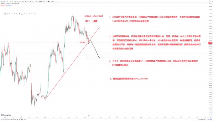 利率决议会议结束了,明明暂停加息, $BTC 却还是在下跌,现在25360是关键位置,所以还是要等好机会去空! 观察了一下市场,还是有不少币种走势不错的,晚点就给会员群的小伙伴们跟新最新策略 #雪球交易部