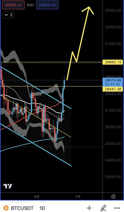 【#ビットコイン】日足↗️ 3万ドルアッパーしなかったら トレード講師引退します。 日次50万💴 #FX #BTC