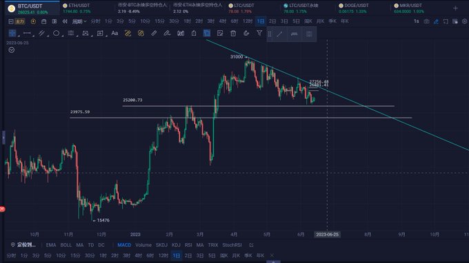 #向阳分析 #向阳商学院 #BTC $BTC 日线是一个三角区 4H走势存在背离转涨的信号 1D-5D走势继续保持看空的信号 短线↑ 中线趋势↓ 我们可以做的事情:放弃这里的小幅上涨,高位捕捉本次反弹的高点,从更高位置空单下来,这样做利润是非常足的…