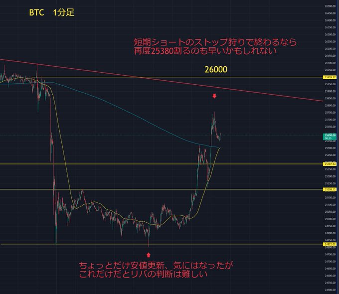 ◇BTC・ETH短期チャート(1分足) 昨日21時近辺にBTC,ETH共に安値をちょこっと割ったので、気にはなりましたが、小さすぎてリバの判断は出来ず(´・ω・`) BTCは直近安値を割って戻るときは、その後リバしやすいです…
