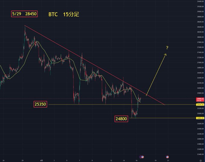 ◇BTC短期チャート(15分足) 目線は↗になりつつあります(´・ω・`) 三角持ち合い↘抜けをすぐ否定、再度25350を割らないなら、5/29 28450からのトレンドラインを超えて上昇に転じるかもしれません 24800底というのは、節目25000をちょっと割った価格で、ロングのLCラインだったのかもしれませんね…