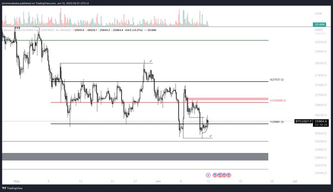◇BTC短期チャート BTCは現在25800ドル付近でレンジになりました(´・ω・`) 底値も若干切り上げているので、収束しつつあります また今夜は重要指標として米CPIがあります 6/13 21:30 アメリカ消費者物価指数05月 BTCはCP発表まで大きく動かないかもしれません…