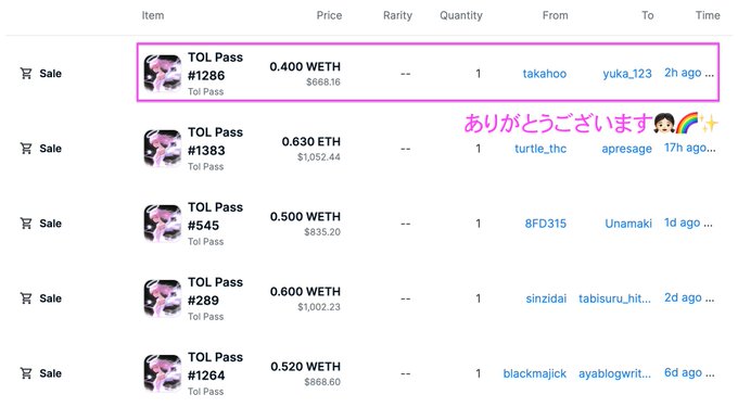 ✅TOL Pass 二次流通で売れてる❤️🔥 ✅0.40 WETH(95,000円) WETHなので、オファーが刺さった感じですね✨ てか、0