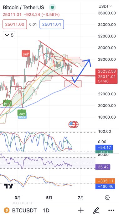 $BTC #ビットコイン 正直25000下抜けしないと思ってたけど笑 こうなると23700-24000あたりで日足の200日移動平均線、チャネルの交点あたりが次のロングの狙い目ポイントかなあ。