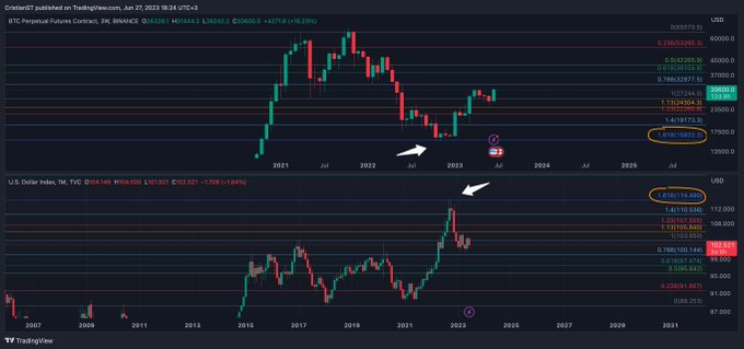 Bitcoin vs DXY 1,618 Fibonacci a dat din nou bottom-ul