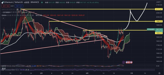 $ETH 4時間足 1900ドルを突破しつつあります。 この調子でいけばざっくりと2000ドル・2100ドルが次の抵抗になります。 ここで一気に上昇の勢いがつく可能性は高いでしょう。 バイングクライマックスほどではありませんが、落とし切って反動をつけたときは相場としてかなり強いものです。