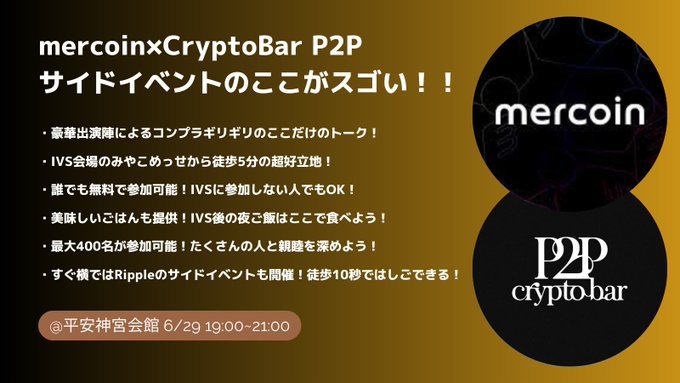 merucoin×CryptoBar P2P主催のIVS2023公式サイドイベントのここがスゴい!! ⚡豪華出演陣のギリギリトーク! ⚡IVS会場から徒歩5分の超好立地! ⚡誰でも参加無料! ⚡美味しいごはんも提供! ⚡最大400名参加可能! ⚡おまけにRippleのイベントまで徒歩10秒! 申し込み👇 https://t