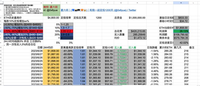 #BTC #ETH #定投 #夏六玥 坚持定投的第216天 😺已定投 285 ETH 🐈定投均价 $1473 😝总利润