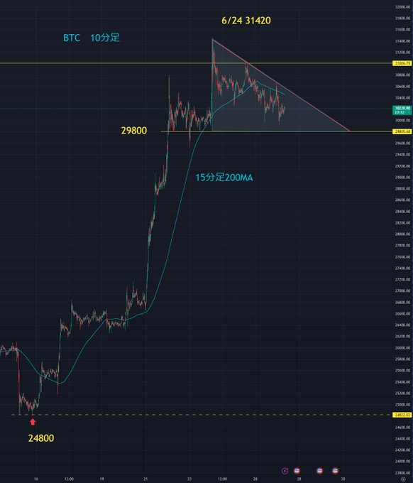 ◇BTC短期チャート(10分足) 15分足200MAを下回ってからは、抵抗線となっているため、↗抜け出来ずに落とされています 高値を切り下げおり、緩やかな高値切り下げトレンドラインが出ています 29800のラインと高値切り下げトレンドラインで小さい三角保ち合いになるかもしれません…