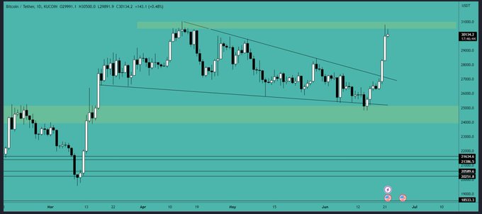 $BTC 真夜中の30000$回帰記念始めます🥃🎊🎊🎊 アルトターンの順番待ちに並んでいますが、上げの角度が鋭角過ぎるので心配しています… 全てがシナリオ通りなら乗らせていただくだけですね。