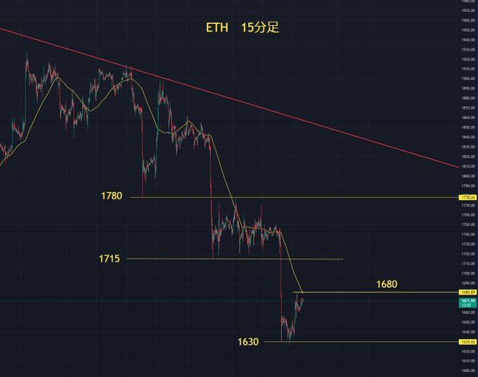 ◇ETH短期チャート 安値更新し続けた弱いチャートから強いチャートへ ETH/BTCの反発を切っ掛けにチャートの雰囲気が変わりました(´・ω・`) 1680のラインを抜けるのも時間が掛からないかもしれません 今後の状況を見つつ、トレンド転換したかどうかの見極めになります #BTC