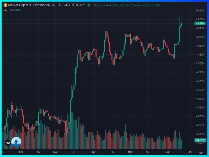 BTC.D重归55%。半年前说什么现在币种比以前多,机构进场,所以BTC市占率再也回不到50%以上。这种屁话的人都哪去了?