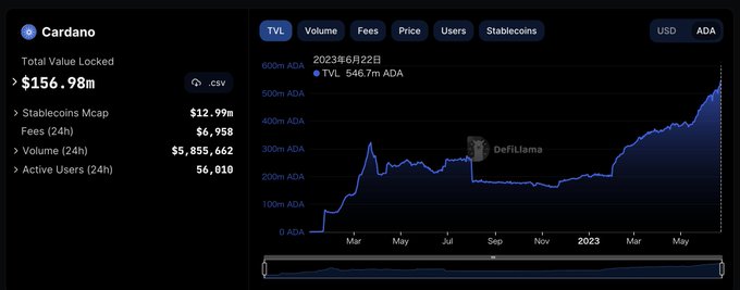 カルダノDeFiが爆発的な成長を継続!🚀 Defillamaによれば、カルダノDeFi のADA TVLが、最高値を更新しており、546