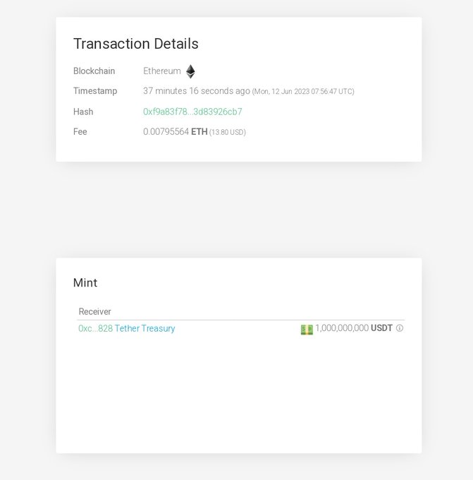 🚨JUST IN: #Tether has just printed another 1,000,000
