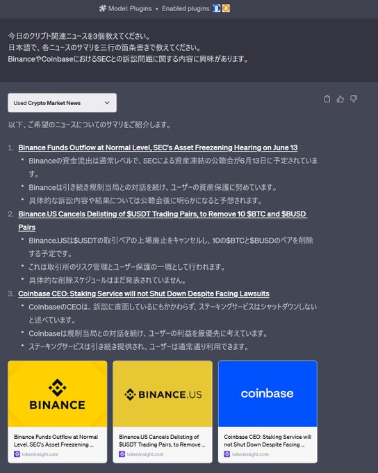 忙しい日のCryptoの情報収集もChatGPT+プラグインで捗る。Bingと併用してる。 https://t