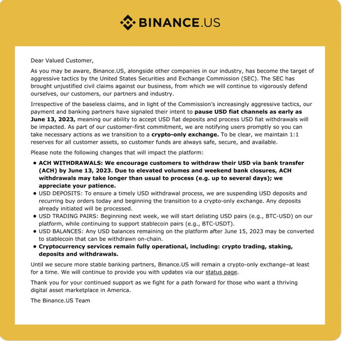 BREAKING: #Binance US to suspend all USD deposits following
