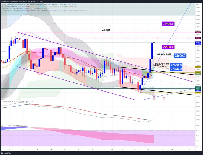 #BTC 6/22 uubnsk なんだかんだ4月高値圏まで到達 流石にダブルトップ(にはならないと思うが)警戒が始まる水準 日足レベルでは28600以下への回帰するのが正常だが、そこは短期足の支持次第なのだ 日中のツイートみとけなのだ 昨夜みたいに短期ロング取る場面もあるのだ